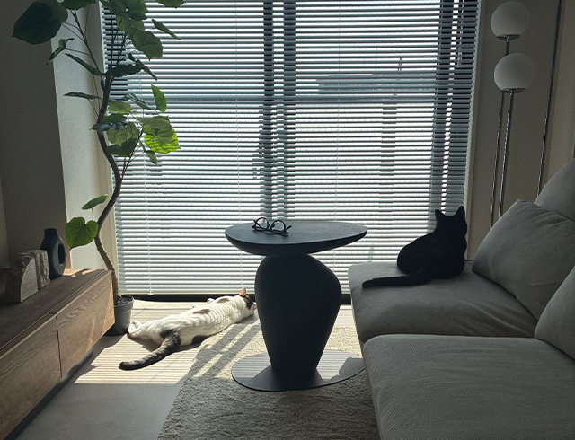 テーブルがなく寂しさを感じていた空間に、マットな質感の黒色と角がない丸みを帯びたデザインがアクセントとなり、存在感を放ちながらも引き締まった空間になりました。
