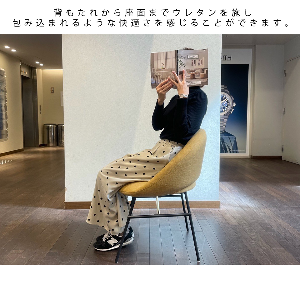 丸く可愛らしい座面ですが、脚は細いスチールを使用している為、スタイリッシュさもありバランスの取れたデザインチェアです。