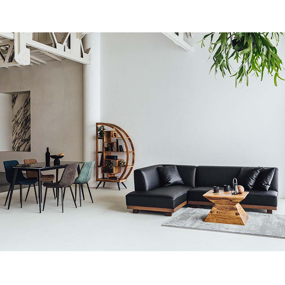 座面、背もたれ部分はかすれたような濃淡のあるポリウレタンレザーを使用していて、初めから使い込んだかのような風合いを感じられるのがこのチェアの特徴です。また、レザーと異素材であるブラックスチールを脚部に採用したことで流行のブルックリンスタイルも意識したデザインになっており、レザーのヴィンテージ風な質感との相乗効果でおしゃれなチェアに仕上がっています。カラー展開とデザイン違いのシリーズ展開もありますので、色違いやデザイン違いをミックスしたコーディネートも可能で、好みの色合いやダイニングとコーディネートする際の使い勝手なども考えて選ぶことができるのも魅力です。