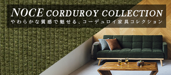 コーデュロイ素材の質感とデザイン性を兼ね備えたNOCEの家具。リラックスできるソファや北欧テイストのチェアでさらに上質な空間を演出します。