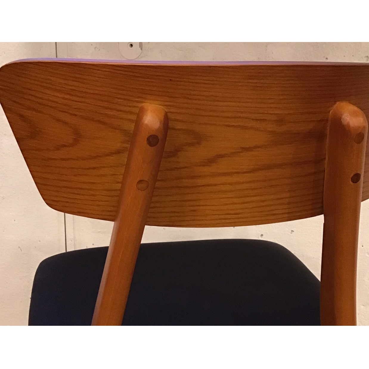 一見チェアらしいベーシックなデザインという印象が強いですが、ゆったりとお掛けいただける広めの座面と背もたれ、後ろから見ると際立つハの字脚など細部のデザインにこだわりが感じられます。ブラウンの木製フレームはウォールナットと比較するとややオレンジっぽい色味で自然なあたたかみがあり、特に幅広の背もたれは一点ずつ異なる天然木の木目の味わいをお楽しみいただけます。また、座面のブラックレザーが程よく上品な雰囲気に引き締め、しっかりとした硬めのクッションなのでお食事以外にデスクワークなどでも姿勢が安定してお掛けいただけやすいです。コーディネートについては、ダイニングテーブルやデスクは同系色のウォールナット系のブラウンはもちろん相性がよく、ブラックスチール・アイアンの脚をお選びいただくと、座面との統一感が生まれてよりメリハリのある雰囲気になりますよ。バイヤーズブログ導線