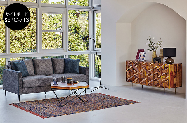 芸術的なインパクトを持つ扉と天然木紫檀(シーシャムウッド)無垢の木質感の融合が魅力的なサイドボードとTVスタンド。紫檀(シーシャムウッド)の木目の美しさは秀逸で、フロントのインパクトに押されていますが上部やサイドにも綺麗に表現されています。「三角すい」の一片を組みあわせ幾何学模様のように構成されています。ランダムな不規則性が抽象的で、とても不思議な絵のように見えます。