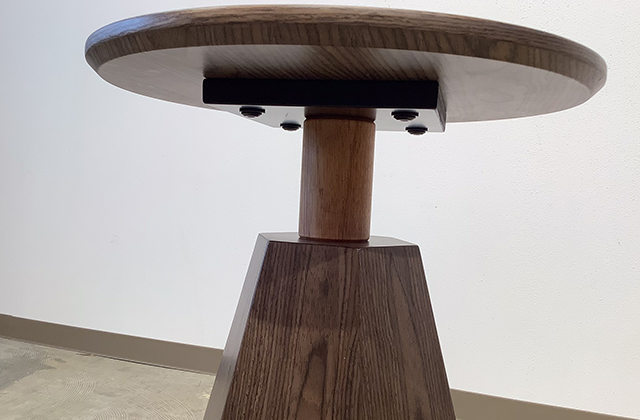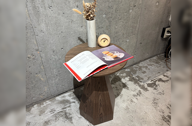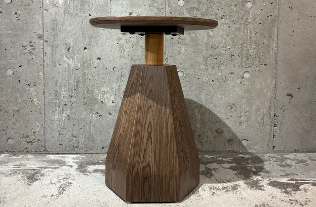 円形のやわらかな印象の天板に、すっと縦に伸びる六角錐型の脚が印象的なサイドテーブル。曲線と直線が織りなすバランスが美しく、コンパクトながらも存在感のあるデザインです。ウォールナットカラーの天板と脚が上品で落ち着いた雰囲気を生み出し、中央のナチュラルカラーの支柱が軽やかなアクセントに。やや高めの設計で、ソファやベッド横でも使いやすく、アートなフォルムが空間に洗練された印象を与えます。