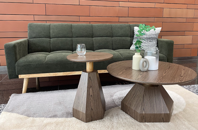 ウォールナットとナチュラルの組み合わせが空間に温もりを添え、モダンにもナチュラルにも馴染むデザイン。ソファ横に置けば上品なアクセントとして引き立ち、ベッドサイドではランプや花瓶を飾る台としても映えます。同シリーズの「コーヒーテーブル9347-CT」と組み合わせると、統一感のあるコーディネートが完成し、リビング全体に優雅でまとまりのある印象をもたらします。