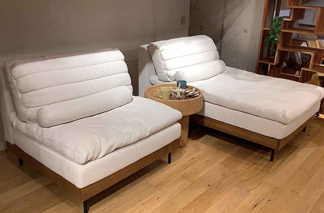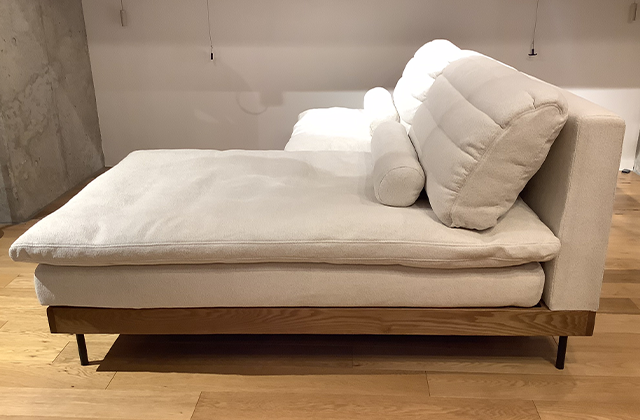 ソファ下部にアッシュ天然木フレームを使用した上質感と温かみを併せ持つカウチソファが登場。木のやさしい表情がナチュラルな雰囲気を演出し北欧テイストはもちろん、シンプルで洗練されたインテリアにも自然と馴染みます。座面カラーと天然木の組み合わせが空間に柔らかなアクセントを加え、脚部には細身のブラックスチールを採用することで、全体をすっきりと引き締めた印象に。重たくなりすぎず軽やかでスタイリッシュな佇まいが魅力的なソファです。