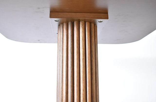縦にきざんだ格子状模様と円柱形の一本脚が目を引く、他にはあまり見られないデザインのサイドテーブル。直線的な縦格子が生み出すリズム感と角を落としたスクエア天板のやわらかなフォルムが美しく調和し空間にさりげない個性を添えます。天板は厚みを抑えてすっきりと仕上げ、脚部の立体感をより際立たせたデザイン。コンパクトながら、置くだけでインテリアのアクセントとして存在感を発揮します。