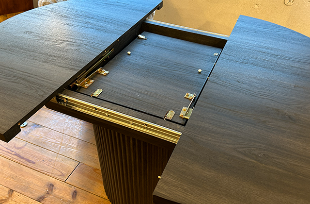 縦格子模様を施した円柱の脚と、すっきりとした天板が印象的な北欧デザインの伸長式ダイニングテーブル。ベルギーとフィンランドからのデザインオファーをもとに設計された、装飾に頼らない本格的な北欧モダンスタイルです。一見すると彫刻のような存在感がありながら全体の構成はシンプルで、空間に自然と溶け込むバランスの良さが魅力。天板は内部に格納された伸長用の天板を引き出すことで楕円形へとスムーズに伸長し、普段使いから来客時まで柔軟に対応します。天板を開くだけで中央に収納された天板が現れ、テーブルと別で保管する必要がない点も大きな特長です。