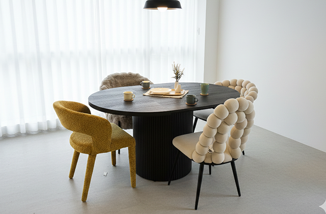 存在感のあるデザインのためインテリアの主役として取り入れるのがおすすめです。木製チェアと合わせれば北欧らしい温かみのある空間に、スチール脚やデザイン性の高いチェアを合わせれば、よりモダンでシュールな印象に仕上がります。モノトーンのカラーリングは強い色味のチェアとも好相性で、コーディネート次第で表情を大きく変えられるのも魅力的です。伸長時には6人でもゆったりと囲めるため、日常の食卓から特別な集まりまで幅広く活躍します。シンプルでありながら印象に残る、テーブル中心のダイニング空間をつくりたい方におすすめの一台です。
