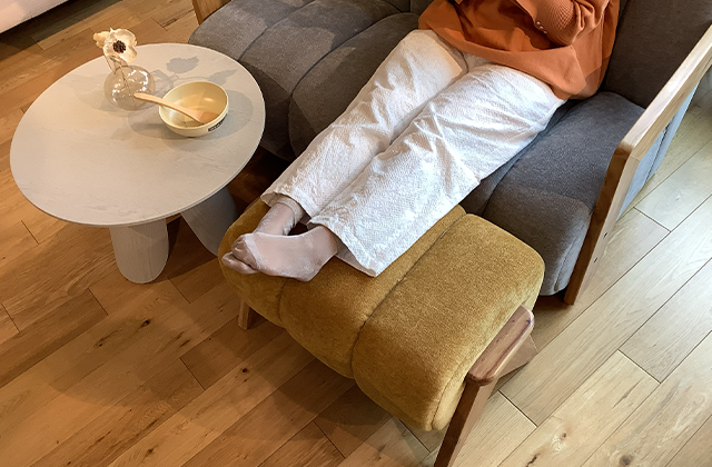 シンプルでバランスの良いデザインはさまざまなインテリアに自然と溶け込みます。ソファ前に置いて足を伸ばすだけでなく、来客時の補助スツールとしても活躍し空間の使い方に柔軟性をもたらします。同系色でまとめれば落ち着いた統一感のある空間に、あえて色を変えればアクセントとしておしゃれな印象に仕上がります。リビングはもちろん、ベッドサイドやちょっとしたくつろぎスペースにも取り入れやすく、暮らしの中で多用途にお使いいただけます。