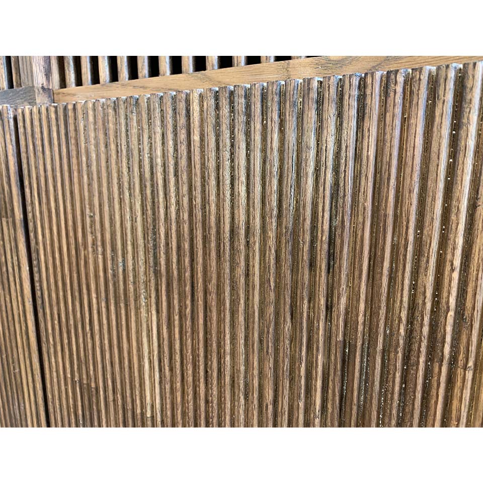 まるで何年も使いこまれたかのような水屋箪笥を思わせる、凛とした佇まいの美しいキャビネット。水屋箪笥の場合、必ずと言っていいほど格子が付いていますが、こちらのキャビネットも縦目の格子があしらわれた引戸があります。この格子は、取手の役割を兼ねており、中に入れたものがわずかに見える事で、収納したアイテムが見やすくなり、家具としての趣も感じさせてくれます。また、引戸を開ける際に格子が交差する様は、機能美を感じさせます。下段の木扉も上段のように、縦目の格子模様があしらわれていますが、実際は木の扉に縦のラインが立体的にほどこされているので、中が見えない作りになっています。下段は収納量が多く実用性の高いキャビネットになっていて、中を見せないことでたっぷり収納してもデザインの邪魔をしません。家具としての実用性はもちろん、そこにあるだけで美しいと感じられるキャビネットです。