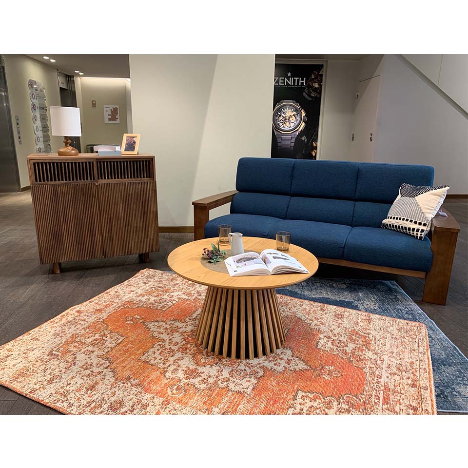 天板や側面部分にはウォールナット天然木突板を使用しており、深みのある色合いが特徴的。天然木ならではの質感や味わいを楽しめます。 扉部分は、オーク材を使用し塗料を乗せて仕上げているので、あえての色むらが楽しめ、素材感の違いが上手くマッチしています。