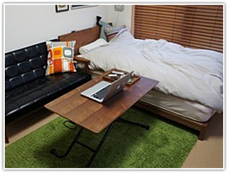 - 高くするにはレバーを引っ張るだけで、低くするにはレバーを引きながら天板を押すだけと非常に簡単に調節できて重宝しています。カフェのような空間に憧れていたので、ソファーに座りながらコーヒーを片手にパソコンをするというお洒落な事が自分の部屋でできました!