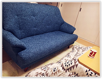 デザインがシンプルかつ機能的で、北欧のテイストがとても気に入っている。木のぬくもりとファブリックの暖かさが、部屋の雰囲気を一層引き立てている。北欧ブルーを基調とした部屋なので、ソファも同系色とした。