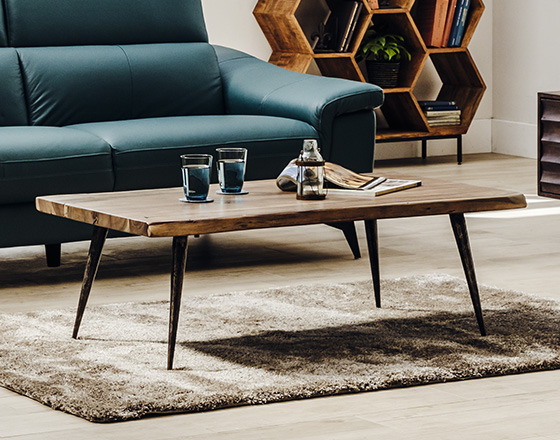 アカシア天然木のライブエッジがポイントのローテーブル。木のうねりを活かした素材感をダイレクトに感じる天板とヴィンテージ加工を施したアイアンの脚がハードな印象のソファーとも好相性です。木製天板ですがグレーのようなくすんだ色合いにのオイルステインなのでソファーのグリーンともバランスがとりやすいです。