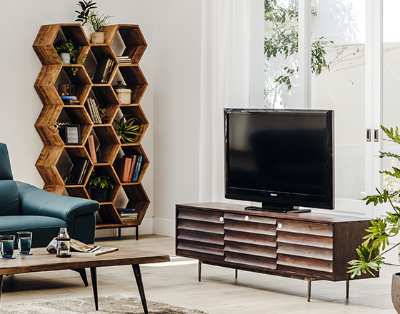 六角形のシェルフが連なったシェルフはどんなシーンでもインパクト大なので、空間のアクセントとしておすすめ。高さのあるアイテムを一点取り入れるとメリハリがあるお部屋づくりができます。TVボードは濃い木製のブラウン×アイアンがモダンな雰囲気で、扉付きの収納が整理整頓しやすく、目隠ししながらお部屋をきれいに保つことができるのでおすすめです。