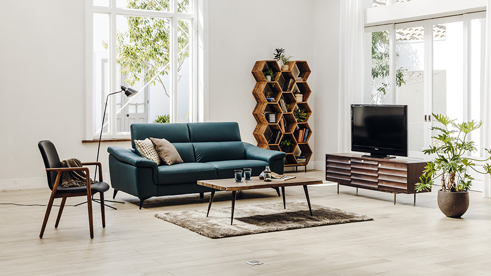 トレンドカラーである、ピーコックブルー(青緑色)のソファーを中心にスタイリング。選ぶのにはちょっと勇気の要る色かもですが、ここでのスタイリングのように、ソファー以外のアイテムを馴染みのあるブラウン系でまとめ、それらのアイテムとバランスをとるようにソファーにブラウン系のクッションをプラスしてあげるだけで、トレンドカラーを纏ったアイテムをバランス良くかつ無理なくプラスすることが可能です。また2mを超えるサイズのソファーとバランスをとるように、ハニカムが連なったデザインの大型シェルフもプラス。ここでのスタイリングポイントは、ソファーのピーコックブルーに近い色味のブルーの小物をシェルフにプラスしたり、グラスにもブルーをプラスしている点。トレンドカラーや色味をプラスしたスタイリング、マイルームで実現してみませんか。