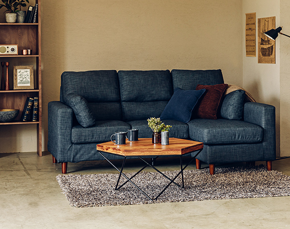 一見ハードな印象ですが、ファブリックのソファーのような温かみのあるアイテムとコーディネートすると印象が柔らかくなります。