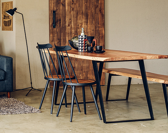 天然木とスチールの異素材を使用したダイニングテーブルとチェアは流行のブルックリンスタイルを演出。スチール素材なので全体に抜け感がでるので、天然木を使用していてもお部屋の雰囲気が重くなりません。