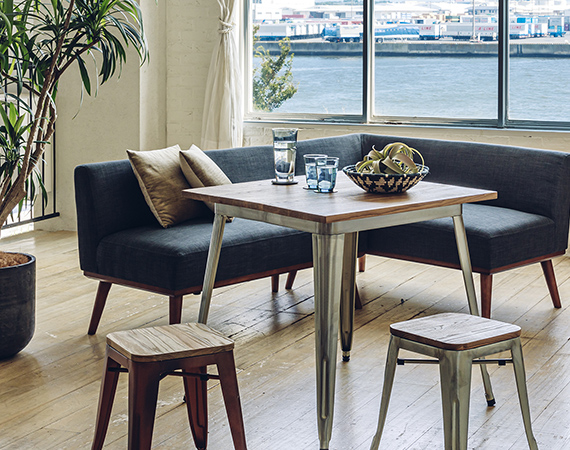 ソファの脚とテーブルの天板が木材ですが、スチールの脚部の1本1本に抜けができているので コーナーソファが幅広でも全体のコーディネートがすっきりと軽い印象に仕上がっています。