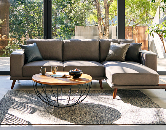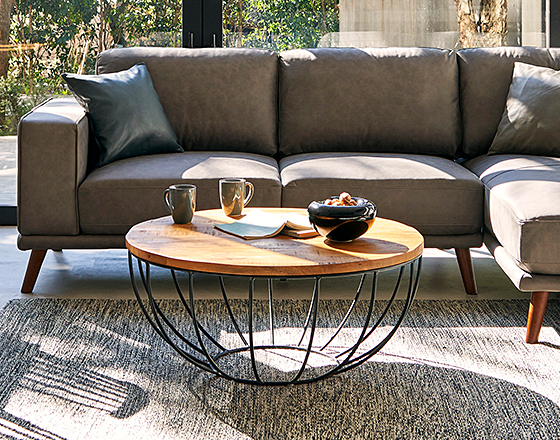 マンゴーウッドの天板の質感が使い込んだようなヴィンテージ風で風合いたっぷりなので、おしゃれなカフェのようなこなれた空間を演出できます。脚部は正円を囲むようにして格子状のスチールパイプが連なっており、360度どこから見てもおしゃれです。ラウンドテーブルはカウチソファのL字の空間に配置しやすく、長方形のアイテムよりも導線を確保しやすいのが魅力です。
