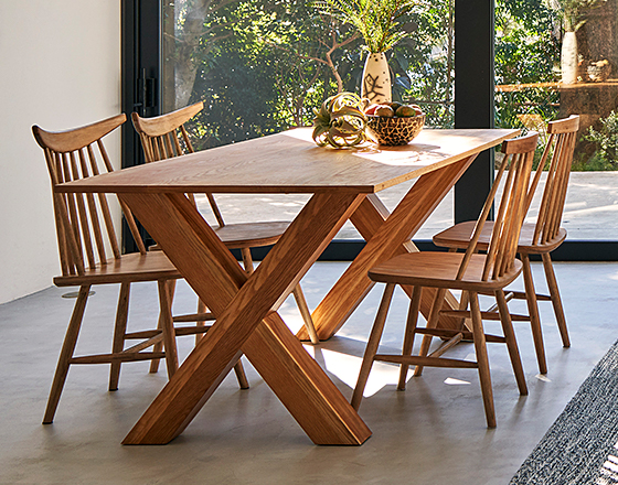 テーブル、チェアともに天然木無垢の上質な雰囲気がお部屋の雰囲気を格上げしてくれます。ダイニングテーブルは幕板がないシンプルなデザインによりオーク無垢の質感をより際立たせていて、太くてどっしりとした脚のⅩデザインがインパクトをもたらしています。チェアには背もたれトップのデザインが異なる2種類のスピンドルチェアを選んでいます。ダイニングテーブルと同系色のブナ天然木の素材感を活かしたオイルフィニッシュで仕上げていますので、テーブルと統一感を持たせることができます。ダイニングシーンが明るい色合いになることでソファーエリアとのコントラストがつき、お部屋全体のバランスも美しく仕上がっています。