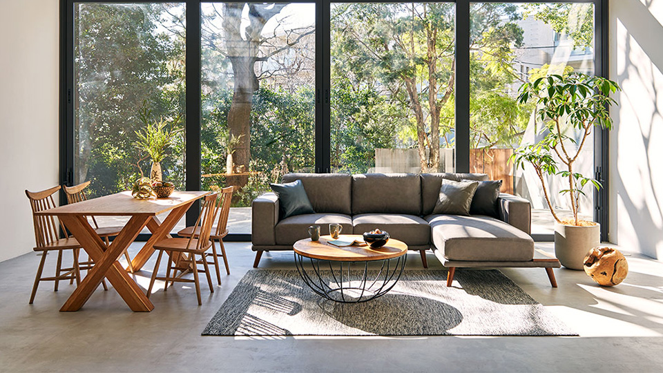 カウチ部に天板のある、ユニークなデザインのソファと、クロスした脚部が印象的なオーク材のダイニングテーブルを中心としたリビングダイニングのスタイリング。インテリアアイテムながら、どことなくアウトドアやグランピングを連想させるダイニングテーブルに合わせ、ウッドを使用したチェアやローテーブルだけでなく、小物でもウッドの球などを組み合わせて、インドアながら、程よいアウトドア感をプラスしてみました。テーブルの脚やソファアームはどっしりと。それに対してダイニングチェアやローテーブルは抜け感を意識。ひとつひとつのアイテムも勿論魅力的なものを組み合わせていますが、重すぎず、軽すぎず。ナチュラルすぎず、モダンすぎず。のこのミックス感を気に入ってもらえたら嬉しいです。