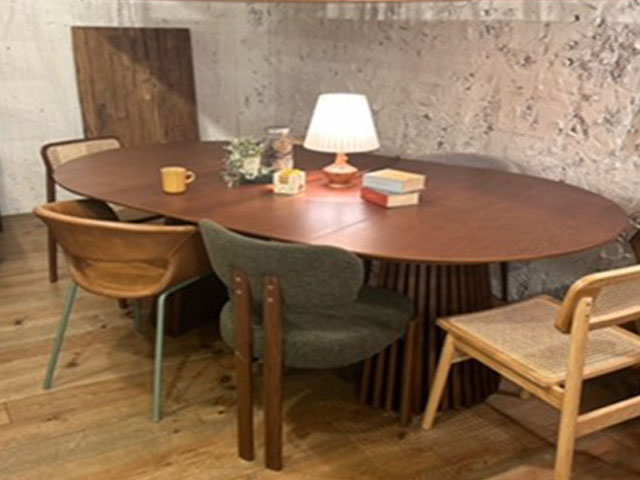 お客様ひとりひとりの暮らしに寄り添う三段階伸縮テーブルです。 天板下のロック金具を外し、付属の板のダボをはめ込んでいただくだけで120㎝の丸テーブルが幅160cm or 200cmのオーバルダイニングに早変わり!チェアも6脚も余裕なので、普段使いから来客時にもご利用いただけます。脚の縦格子×天然木のイマドキなジャパンディデザインがお部屋をグッと上質に整えてくれます。渋谷店に展示があるのは秋らしい深みのあるウォールナット色ですが、お色違いのご用意もございます。